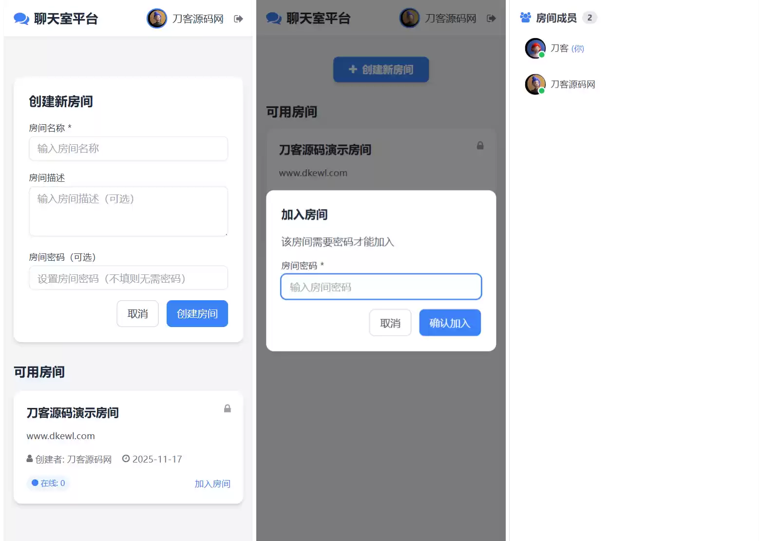 房间管理:支持创建带密码保护的群聊房间,加入房间需要验证